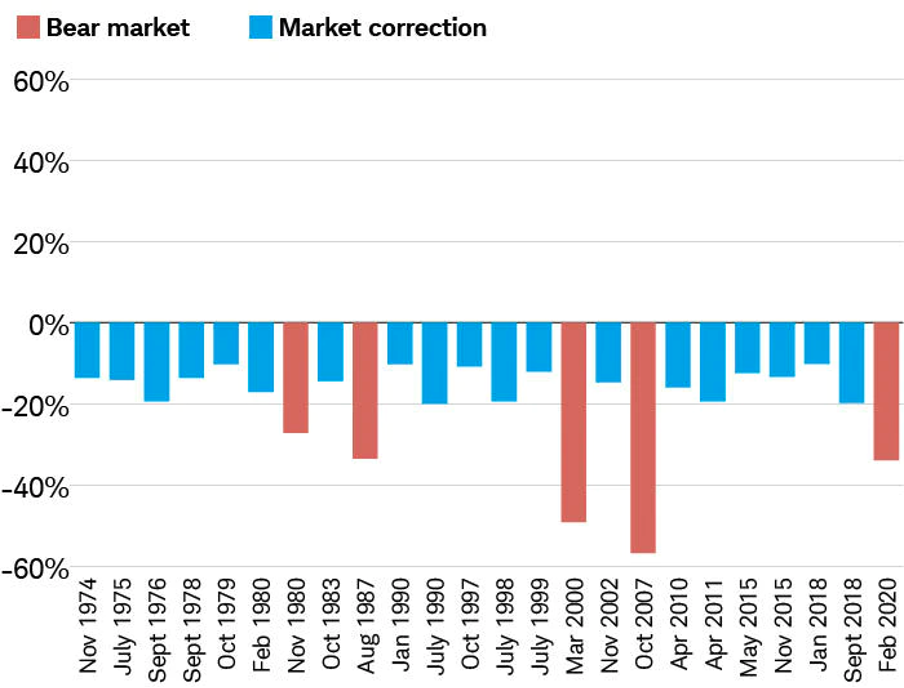 With the proper timeframe, I would suggest the good times only get better with each significant decline in stock prices. Before we look at that, let’s lean into the history of stock market drops. I came across some great charts (via Schwab) depicting all the corrections & bear markets since 1974. As you can see, we’ve experienced 24 declines of 10%+ through 2020 (As I write this, you can add one more for the latest drop). Of the 24, five entered the bear market territory.